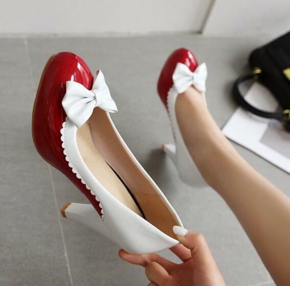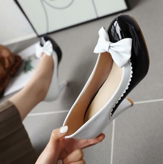 Women Girls Round Toe Cute Bows Mary Jane Block High Heels Pump Shoes Plus Size
