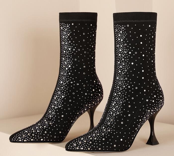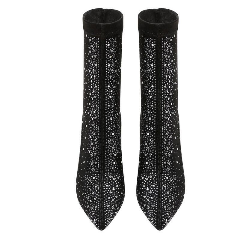 Womens Fashion Pointy Toe Diamante Stretchy Ankle Boots High Heels Party Shoes